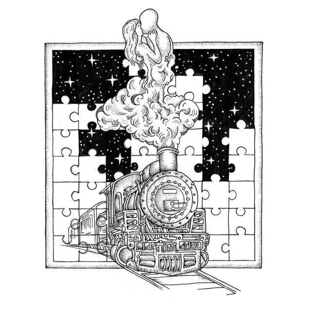 Can you find two pieces that fit together? A metaphor for understanding each other in order to connect the pieces and the journey you take with someone. The steam in the illustration is a metaphor for the passion in the relationship.