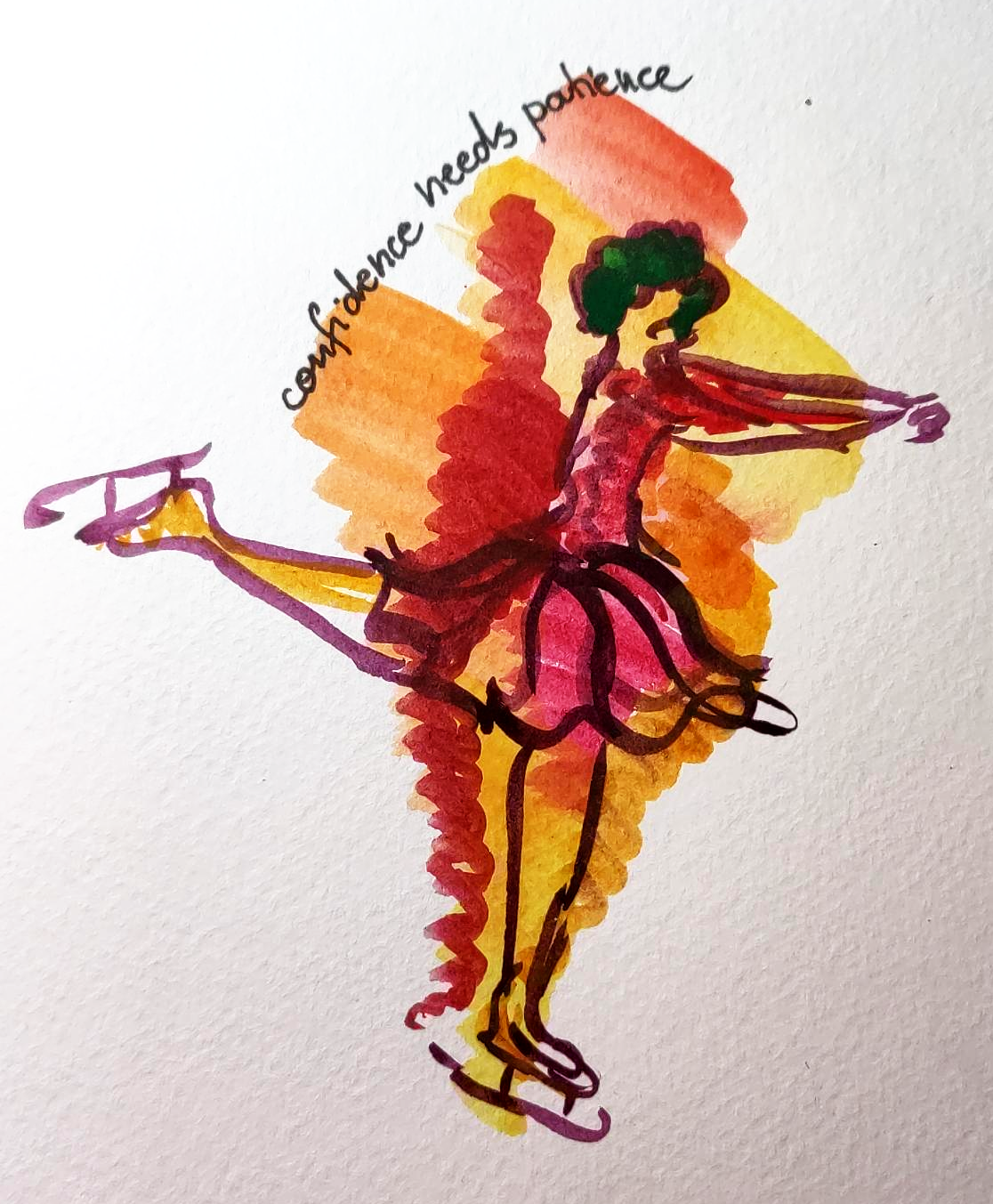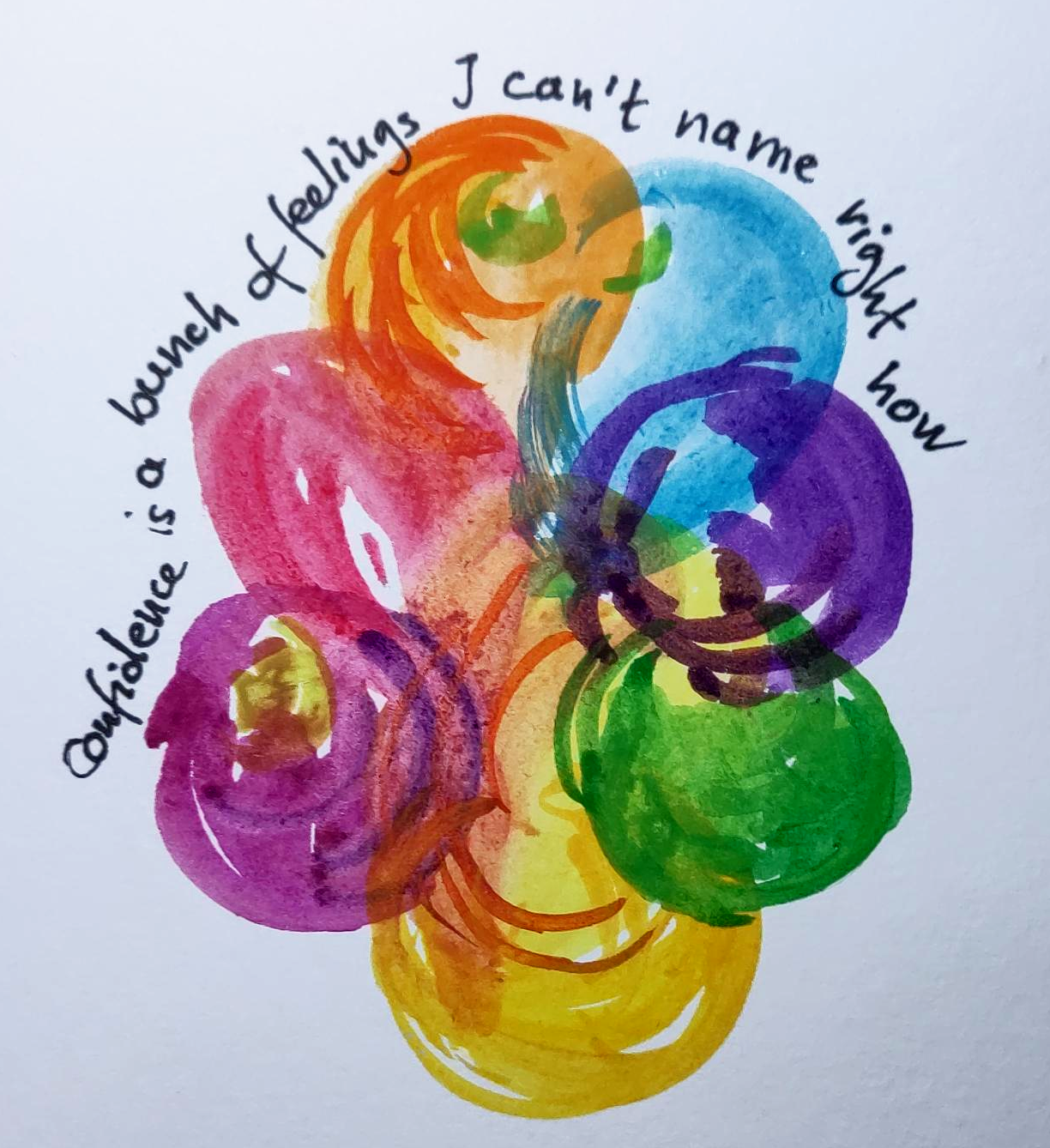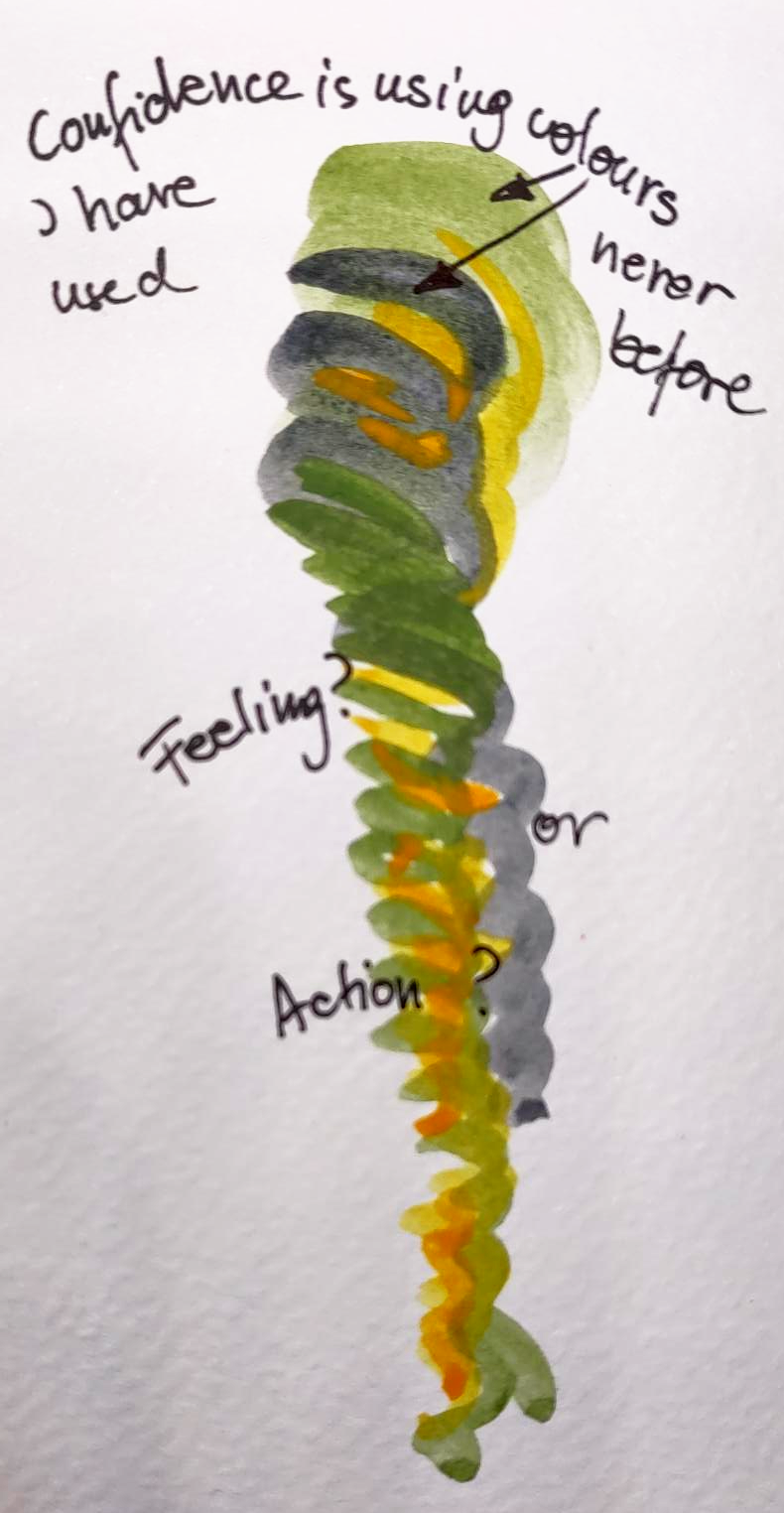 Te next days, I asked myself whether confidence is a feeling or perhaps a name for a whole range of feelings? Or maybe it’s not even a feeling but something you do. Or a mindset, perhaps? I looked at my watercolour paint set and noticed that I had never used certain colours. I tried using them to see if I could give them a part to play in my art.