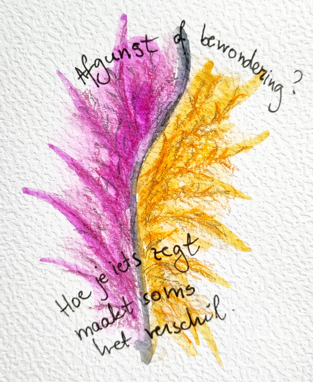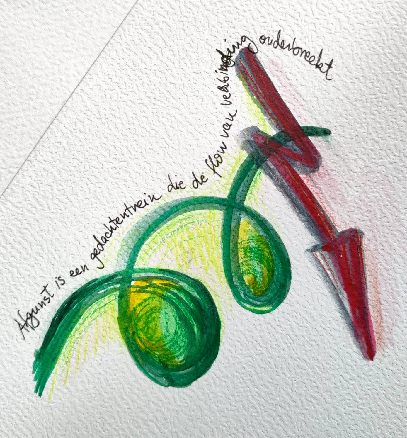 Afgunst tekenen was een heel interessante ervaring. Ik wist niet zo goed hoe of waar ik moest beginnen, vooral omdat ik vorige week jaloezie en afgunst door elkaar haalde. En terugkijkend op mijn tekeningen, valt me op dat ik veel te zeggen had over de gedachten die ik met afgunst verbind. Het is alsof afgunst niet eens een gevoel is, maar meer een verhaal in mijn hoofd. En ik denk dat ik nu beter kan loslaten als ik zoiets voel of denk, omdat ik heb nagedacht over hoe afgunst me in de weg kan staan.